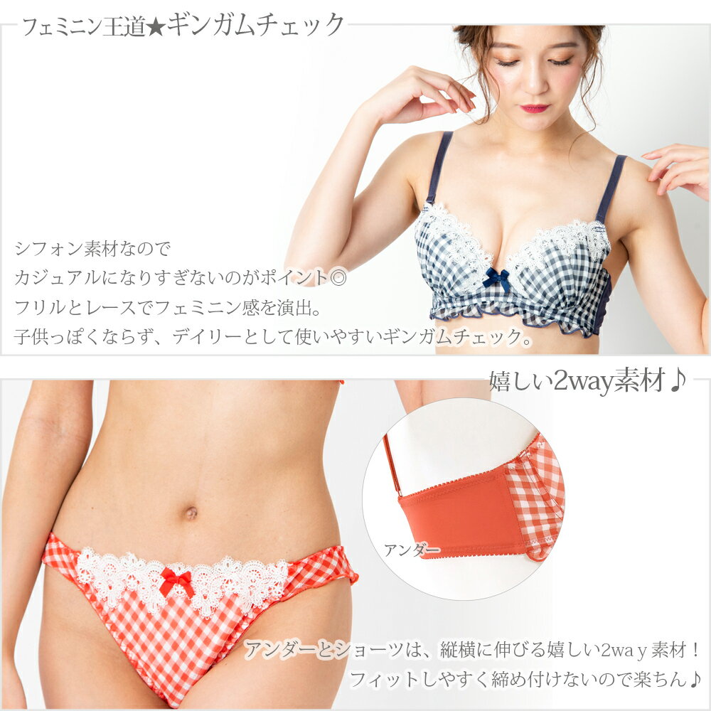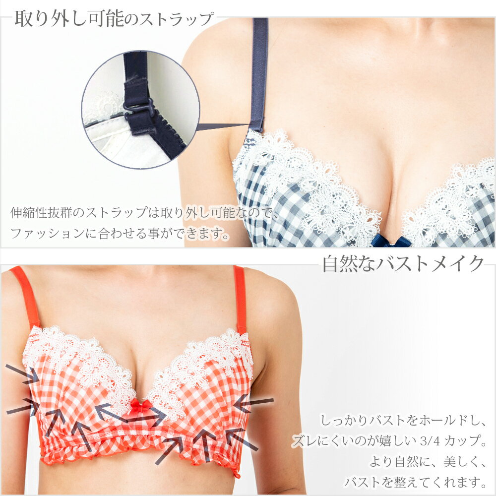 ◆素材構成 : ポリエステルポリウレタンその他◆商品特徴 : ギンガム チェック フェミニン ナチュラル かわいい 締め付けない ≪企画:日本 - 生産:中国≫------◆ブラの種類: 3/4カップ◆カップ: バイリーンカップ◆パッド: パッドあり◆フックアイ: 2段3列 [B-Fカップ] 3段3列 [Gカップ]◆ストラップ: 付け替え可。
